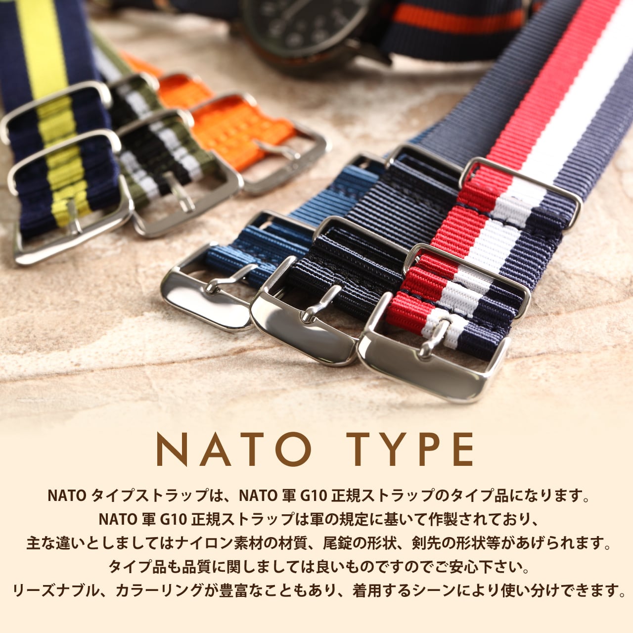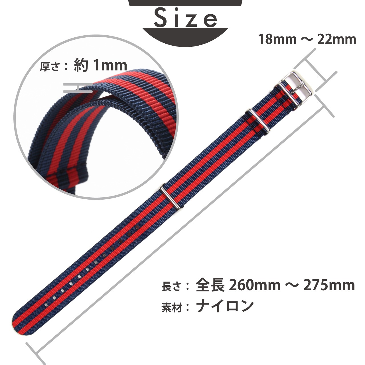 用途・素材: 腕時計ベルト ナイロンベルト / コットンナイロン ステンレス(バックル部分にはバネ棒を使用しないステンレス製尾錠を採用。丁寧に磨いた光沢、サビに強いです。(バックル部分について、カラーによってはバネ棒を使用しています。)